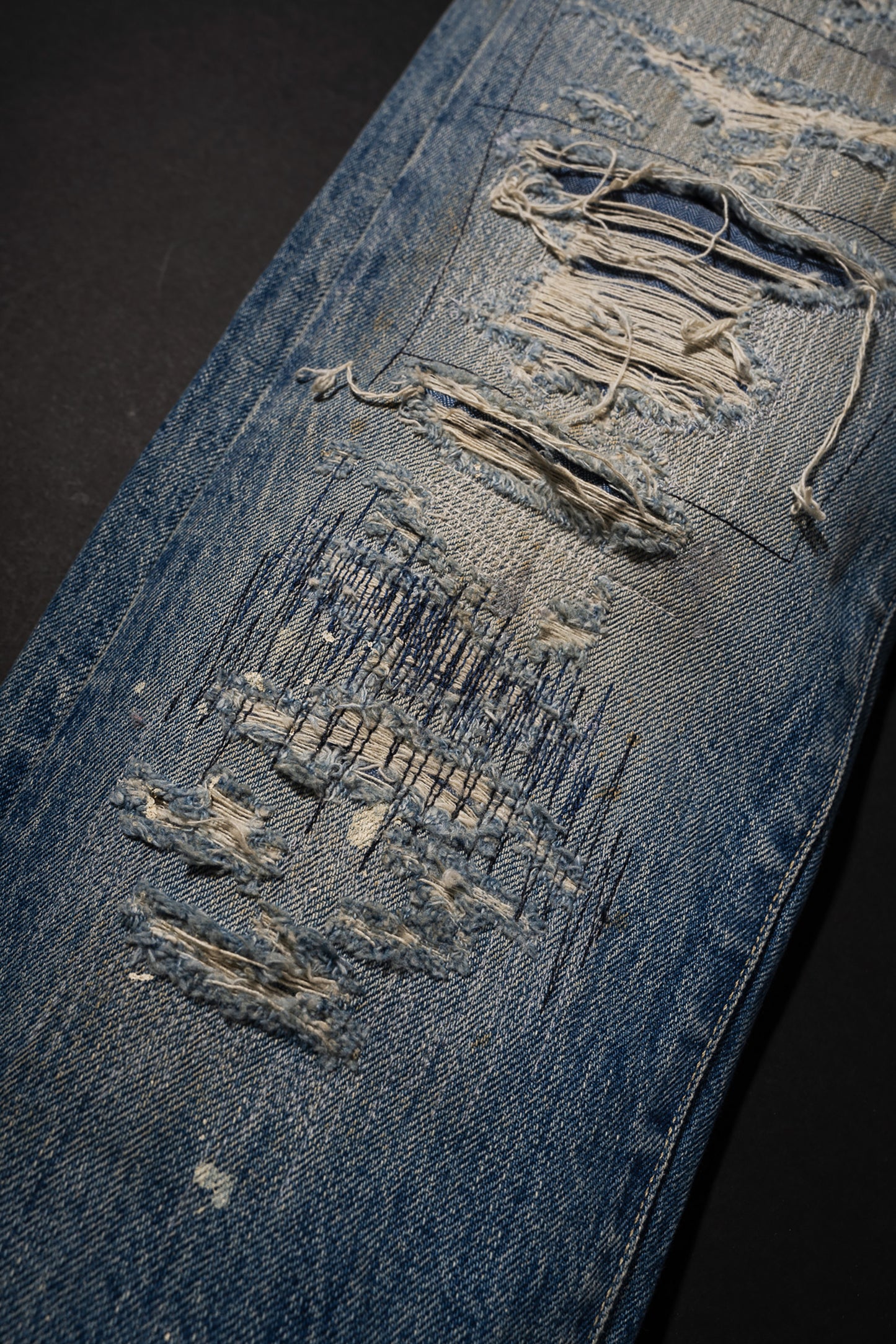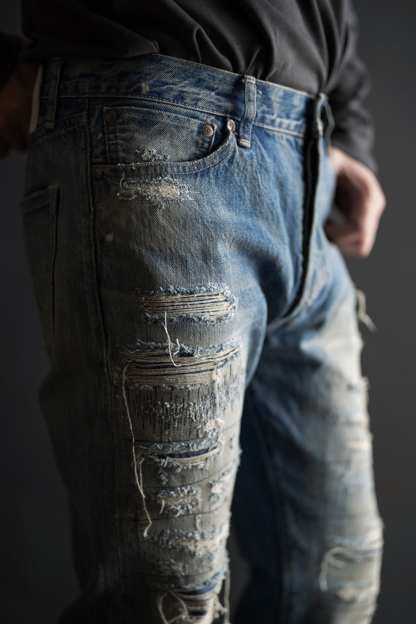 長年穿き込んだジーンズ特有のヒゲやアタリ感を、職人の手によって一つ一つ丁寧に再現!破れからリペアを重ねた跡のハンドステッチやランダムなステッチワークは、まさに唯一無二のアートピース。ロックやグランジを愛する方にふさわしいアイテム。