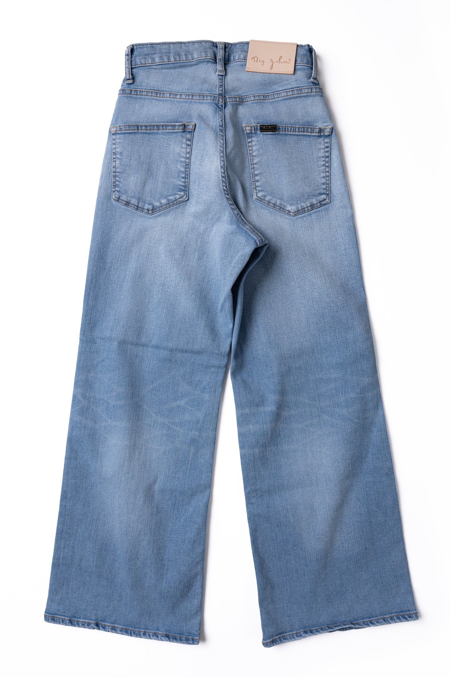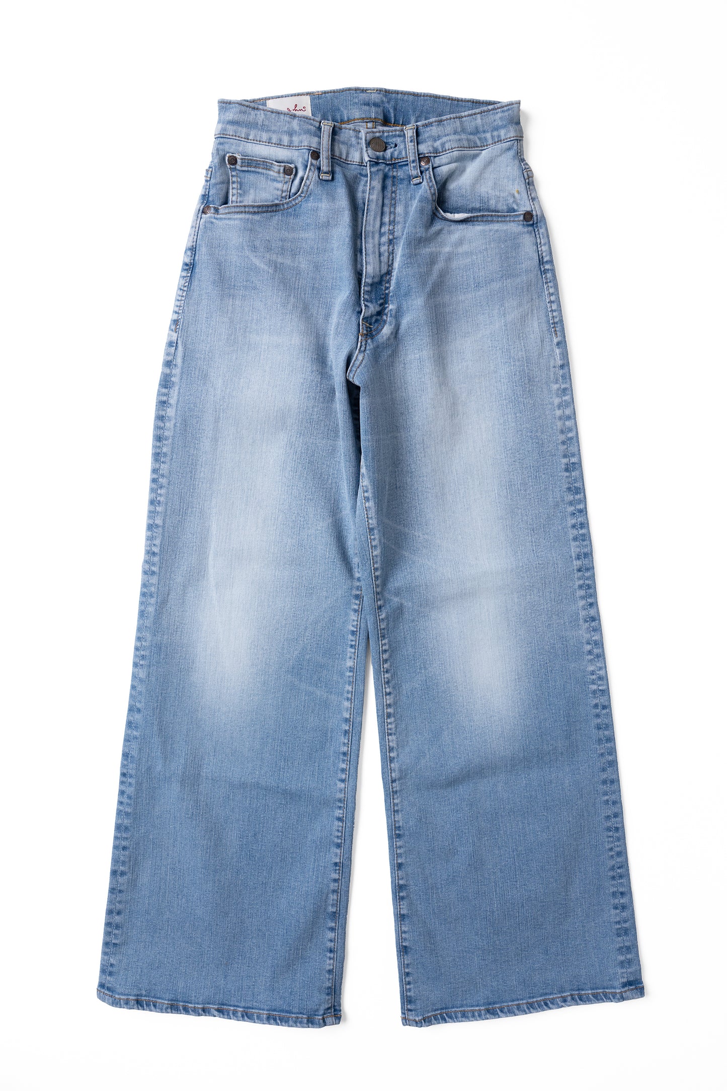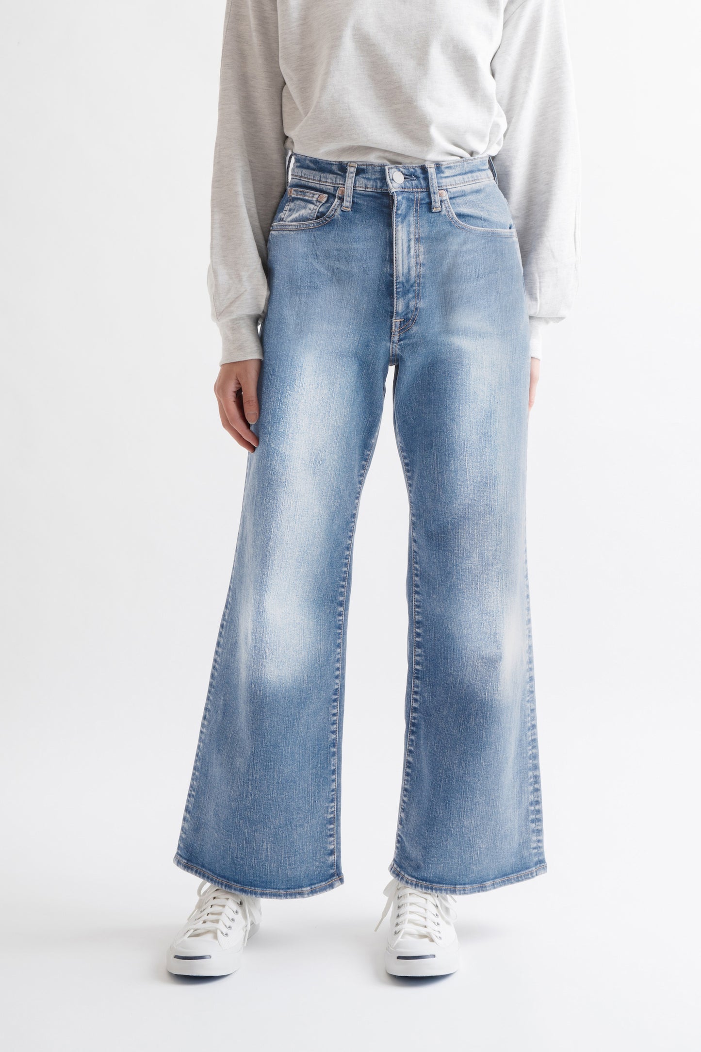 レディースM3(エムスリー)シリーズの中でも好評のワイドフレアカットデニムは女性らしさを忘れず動きやすさも兼ね揃えた商品。短めのトップスとのバランスが取りやすいシルエットです。